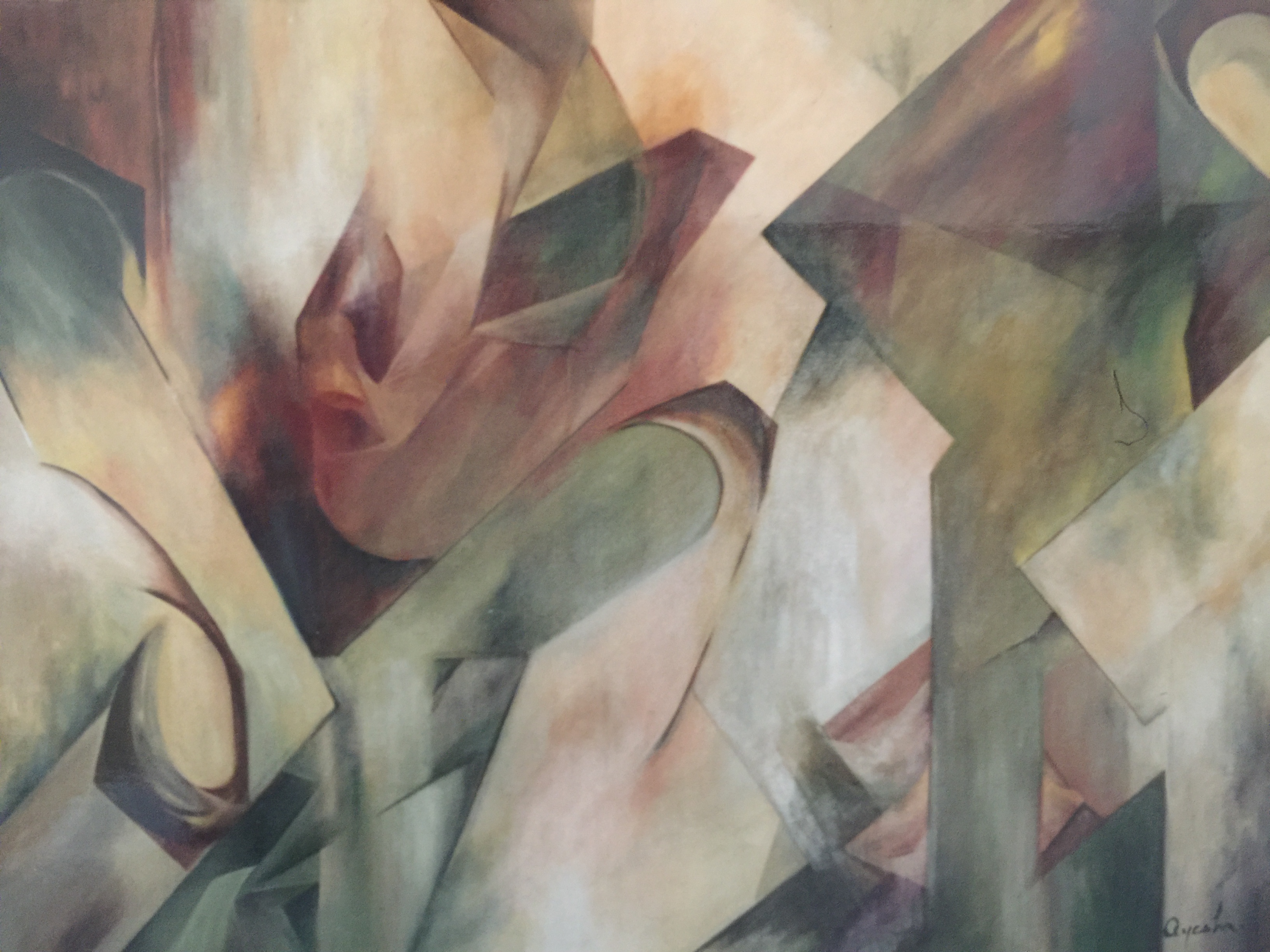 A composition is done using geometric and expressionistic forms . The softer hues are encased in the linear spaces. the painting has a collage like effect.